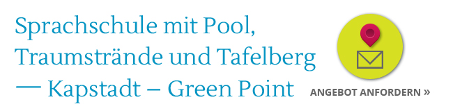 Unsere Sprachschule liegt im Viertel Green Point, ein beliebtes Viertel um den gleichnamigen Park und das WM-Stadium. Green Point liegt am Fuße der Signal Hills an der Küste des Atlantiks. Die V&A Waterfront ist nur wenige Gehminuten entfernt. Das Viertel gilt als jung und hip, viele Grünflächen wechseln sich mit stylischen Restaurants und trendigen Clubs ab.