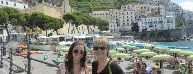 Mutter und Tochter am Strand von Amalfi mit bunten Sonnenschirmen und historischen Gebäuden im Hintergrund während einer LISA! Sprachreise