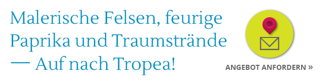 Wie eine Königin auf ihrem Thron erhebt sich das Städtchen über dem Meer. Die steilen Felsen, auf welchen Tropea erbaut wurde, gehen fließend in die Hausfassaden über. In den kleinen Geschäften und Läden der verwinkelten Altstadtgassen lässt sich herrlich bummeln. Hervorragende Restaurants und Trattorien verwöhnen ihre Gäste mit aromatischen Speisen, die roten Zwiebeln Tropeas sind die Hauptzutat. Zu Füßen der Stadt liegt ein feiner weißer Sandstrand am türkisblauen Meer. Bei klarer Sicht zeigen sich von hier aus sogar die Vulkaninsel Stromboli und die Liparischen Inseln. -